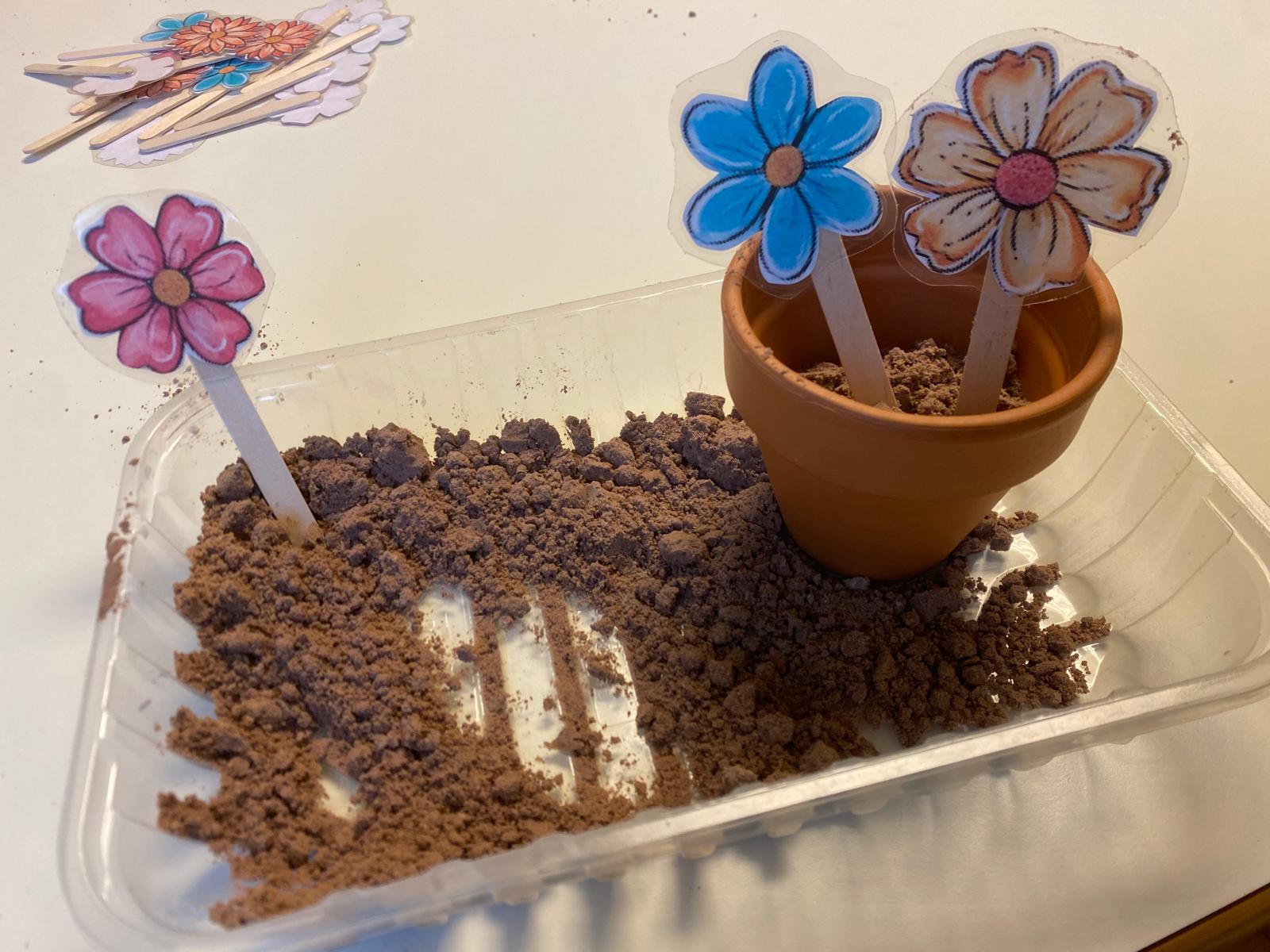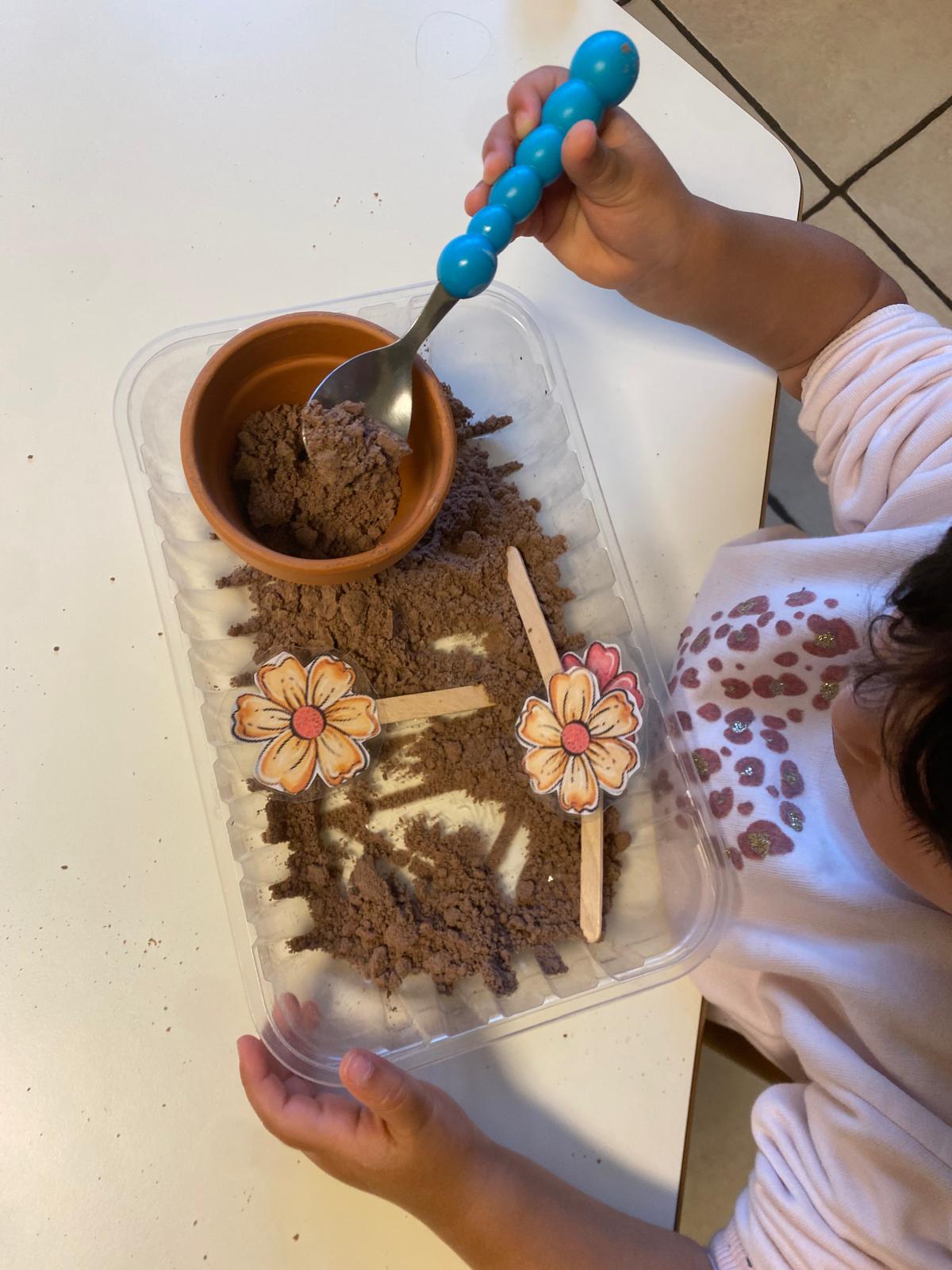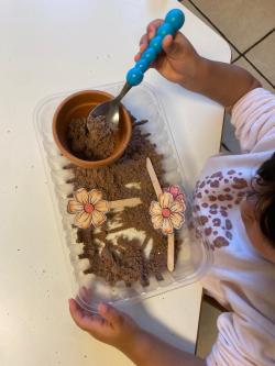 Un'altra attività proposta è invece quella della terra edibile, in cui viene ripresa l'attività vera del giardinaggio, ma in chiave più simbolica e con materiali sicuri che danno possibiltà di esplorazione e fantasia!