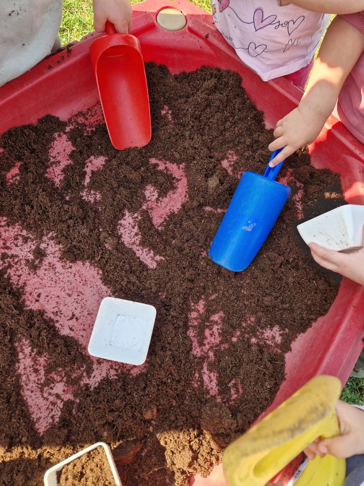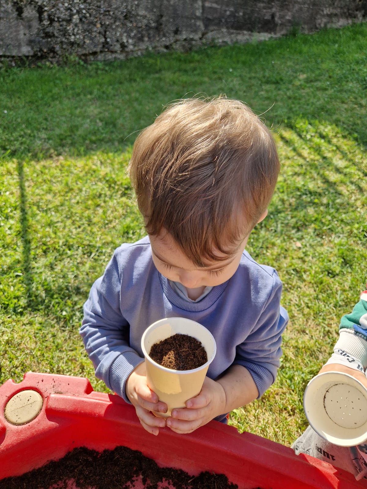 Prima di tutto lasciamo loro esplorare la terra, dandogli la possibilità di utilizzarla come meglio credono...quindi ci sarà chi travasa, chi la trasporta sulla carriola o chi la carica sul camioncino!